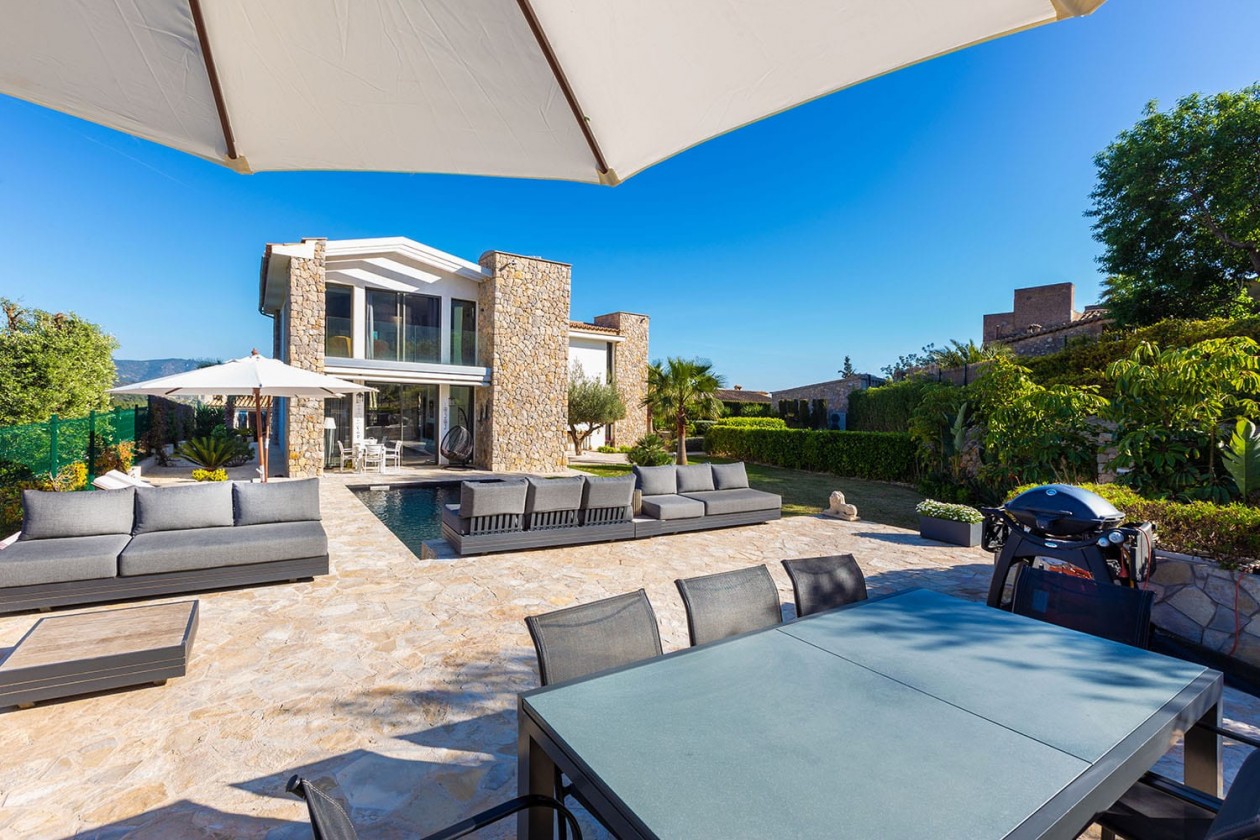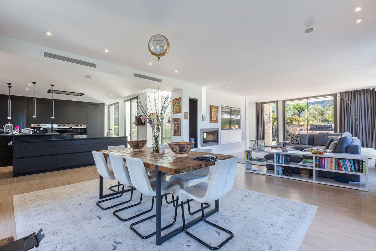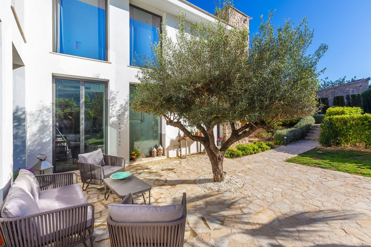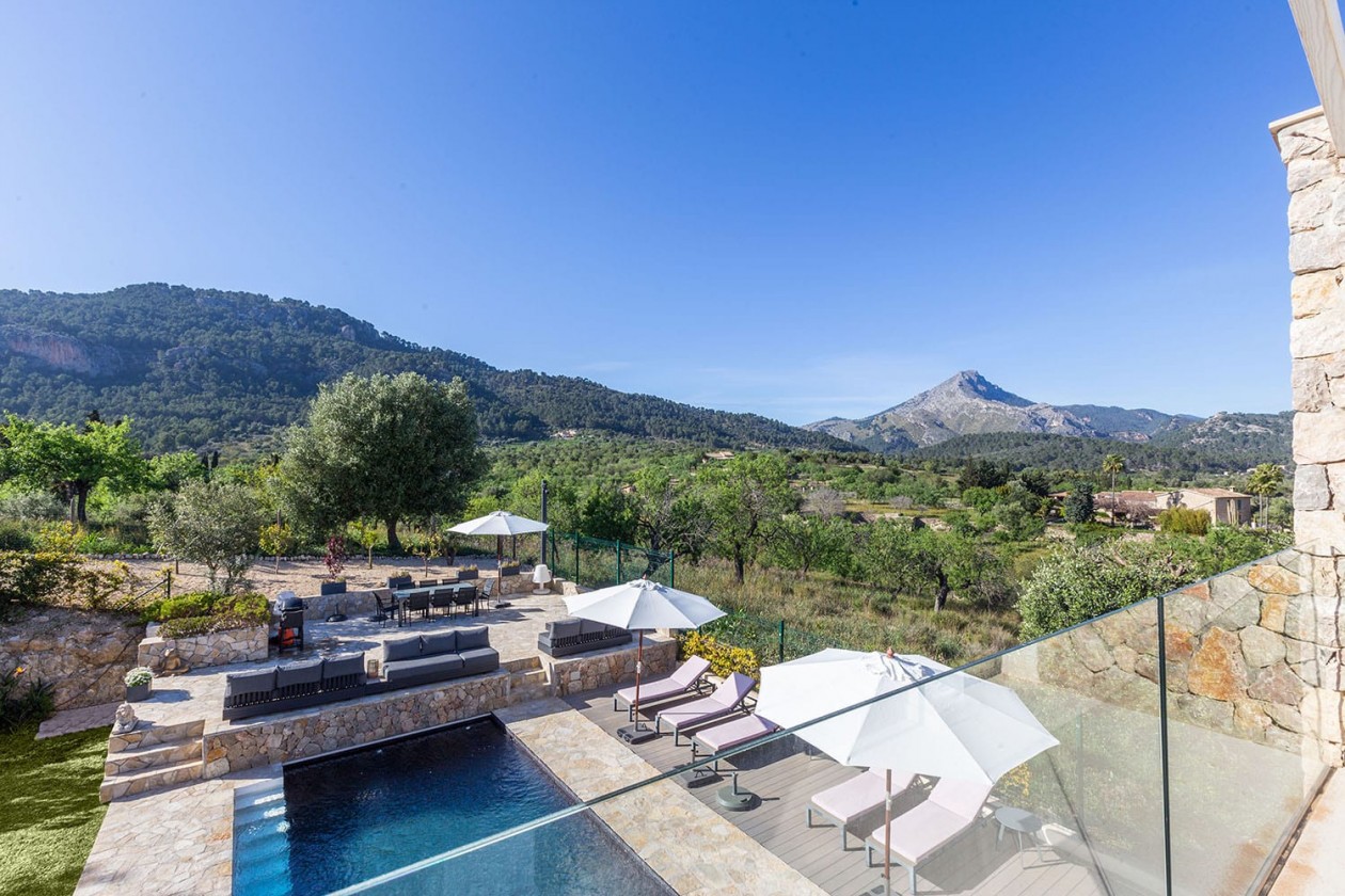 Diese hochwertige Villa wurde 2019 fertiggestellt und befindet sich auf einem großzügigen, 1.345 m² großen Gartengrundstück, das absolute Ruhe und Privatsphäre bietet. Die Wohnfläche von 304 m² verteilt sich auf zwei Etagen und beeindruckt durch ein elegantes Zusammenspiel moderner Architektur und mediterraner Stilelemente.Das charmante Dorf Es Capdellà liegt eingebettet in die sanfte Hügellandschaft am Fuße der Sierra de Tramuntana. Die beliebten Küstenorte des Südwestens wie Santa Ponsa, Paguera und Port d’Andratx sind in nur ca. 15 Autominuten erreichbar.Großzügige, lichtdurchflutete Räume mit bodentiefen Fenstern eröffnen aus nahezu jedem Zimmer einen herrlichen Blick auf die umliegende Natur. Die Villa verfügt über insgesamt 4 Schlafzimmer und 4 Bäder, davon drei Schlafzimmer mit Bädern en suite im Obergeschoss. Im Erdgeschoss befinden sich ein stilvoller Wohn-/Essbereich, eine offene Designerküche mit angrenzendem Hauswirtschaftsraum, ein weiteres Schlafzimmer mit Bad en suite sowie ein Gäste-WC.Modernste Haustechnik wie Fußbodenheizung, Klimaanlage und ein durchdachtes Beleuchtungskonzept sorgen für höchsten Wohnkomfort das ganze Jahr über. Der gepflegte Außenbereich bietet einen einladenden Swimmingpool sowie mehrere Terrassenflächen zum Entspannen und Genießen. Ein separater Technikraum und ein Doppel-Carport runden dieses hochwertige Angebot ab.Ausstattung: • Grundstücksfläche: 1.345 m² • Wohnfläche: 304 m² • 4 Schlafzimmer, 4 Bäder • Gäste-WC • Fußbodenheizung • Klimaanlage • Swimmingpool • Doppel-Carport • Ruhige, ländliche Lage