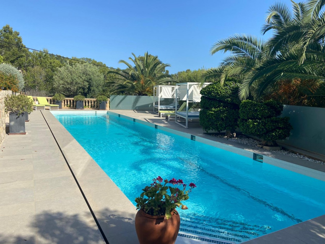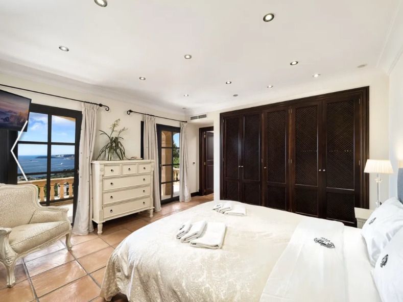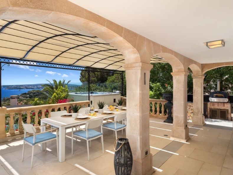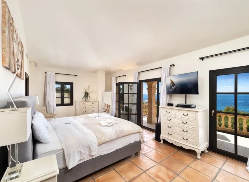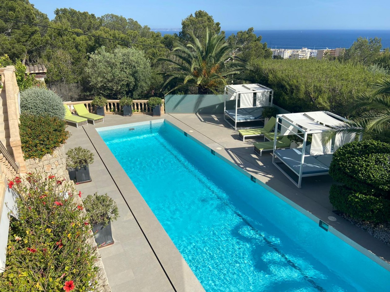 In privilegierter Hanglage von Costa d’en Blanes – einer der exklusivsten Wohnadressen im Südwesten Mallorcas – entfaltet sich diese mediterrane Villa als Oase der Ruhe, des Komforts und der Raffinesse. Auf einem ca. 1.050 m² großen Grundstück gelegen, bietet das Anwesen rund 398 m² Wohnfläche, verteilt auf fünf stilvoll gestaltete Schlafzimmer, jeweils mit eigenem Bad. Klare, zeitlose Architektur, lichtdurchflutete Räume und ein nahtloser Übergang zwischen Innen- und Außenbereich schaffen ein einzigartiges Wohnambiente. Die großzügige Terrasse mit Pool und eleganten Lounge-Bereichen eröffnet einen traumhaften Blick auf das Mittelmeer – perfekt für entspannte Stunden in geschützter Privatsphäre. Costa d’en Blanes steht für höchste Lebensqualität, Sicherheit und Internationalität. In unmittelbarer Nähe befindet sich der renommierte Yachthafen von Puerto Portals – ein Treffpunkt für internationale Gäste, exquisite Gastronomie, stilvolle Boutiquen und mediterranes Flair. Familien profitieren zudem von der Nähe zu internationalen Schulen, wie der angesehenen Agora Portals International School, die nur wenige Minuten entfernt liegt. Auch Palma, der Flughafen und mehrere erstklassige Golfplätze sind in kurzer Zeit erreichbar