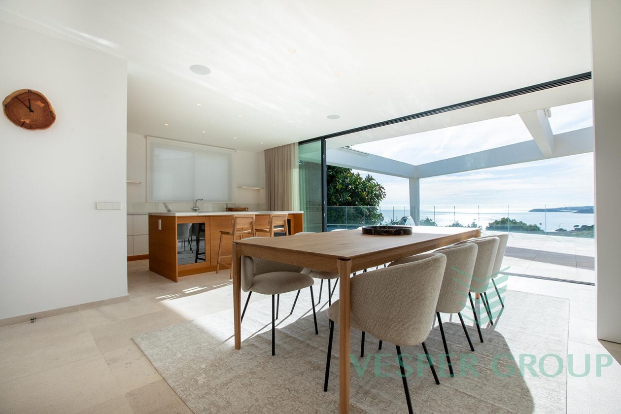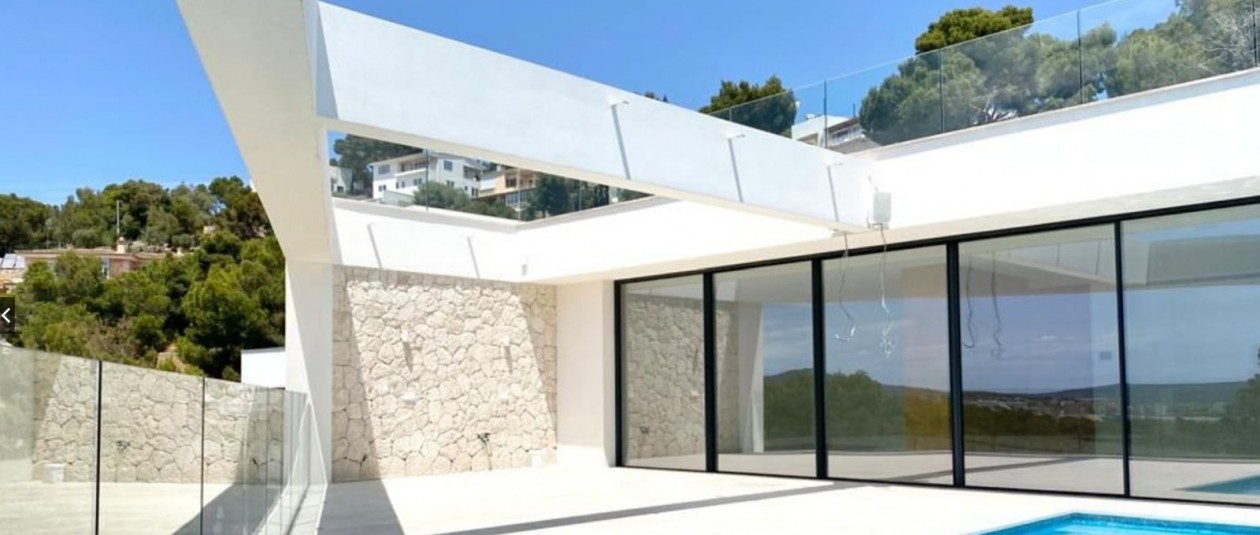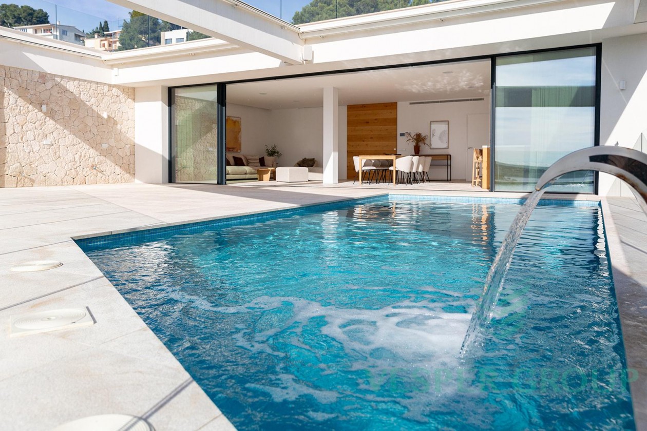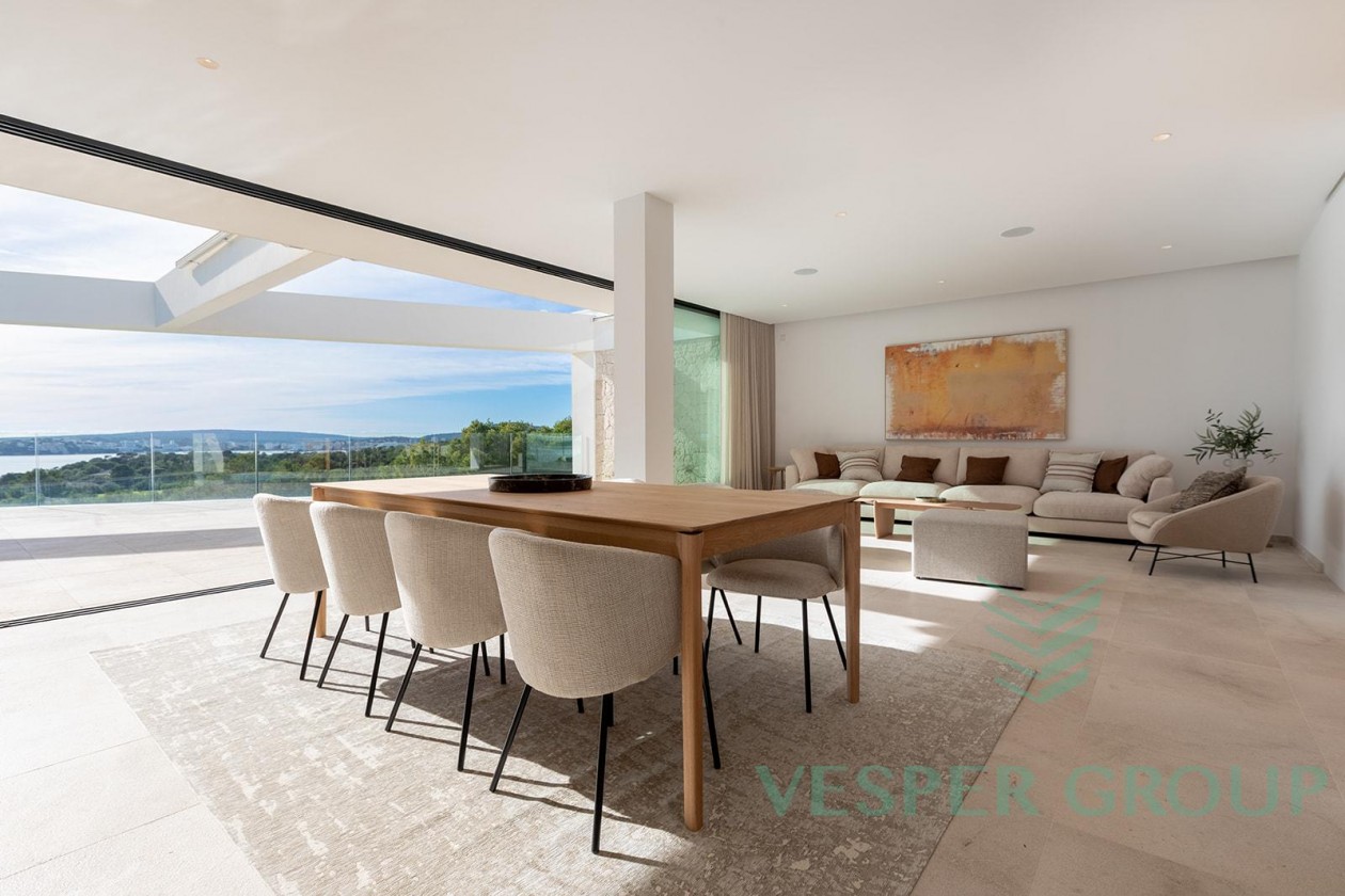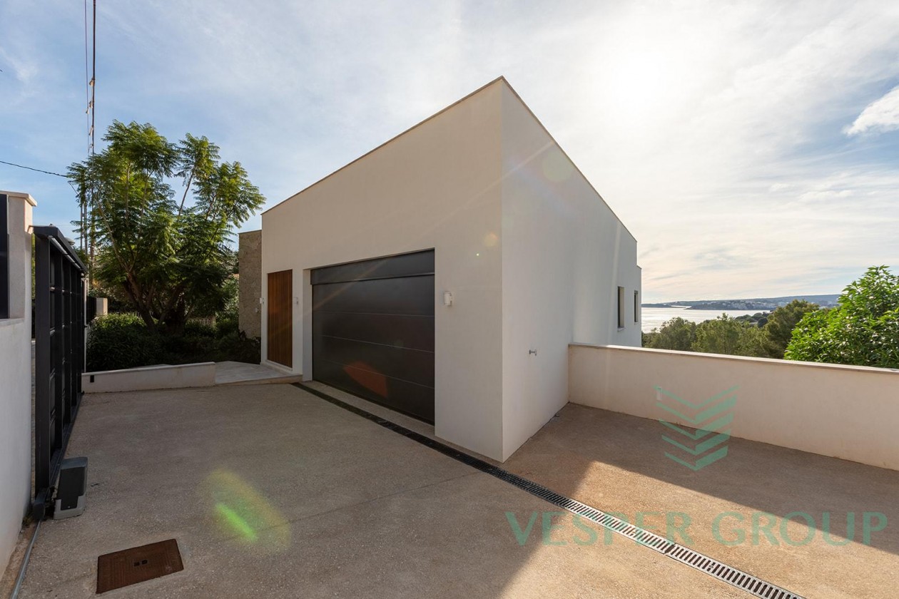 Diese elegante Neubau-Villa in Costa d’en Blanes überzeugt durch zeitgemäße Architektur, lichtdurchflutete Räume und einen fantastischen Meerblick. Sie befindet sich auf einem 1.174 m² großen Grundstück und bietet eine bebaute Fläche von 450 m², verteilt auf zwei Ebenen sowie eine großzügige Dachterrasse. Bereits beim Betreten der Villa öffnet sich durch bodentiefe Fenster der Blick auf das Mittelmeer – ein Panorama, das sich durch den gesamten Wohn- und Essbereich sowie die offene Küche zieht. Auf dieser Eingangsebene befinden sich zudem ein Gästezimmer mit Bad en suite und ein separates Gäste-WC. Im unteren Bereich der Villa liegen drei weitere Schlafzimmer, darunter die großzügige Master-Suite – alle mit eigenen Badezimmern en suite. Insgesamt stehen 4 Schlafzimmer und 4 Bäder zur Verfügung, was ausreichend Platz für Familie und Gäste bietet. Der gepflegte Garten mit großzügiger Rasenfläche eignet sich hervorragend für Kinder oder Haustiere. Ein weiteres Highlight ist die Dachterrasse mit Meerblick, die sich ideal für entspannte Abende oder gesellige Zusammenkünfte eignet. Ausstattung im Überblick: • Grundstücksfläche: 1.174 m² • Bebaute Fläche: 450 m² • 4 Schlafzimmer, 4 Badezimmer • Gäste-WC • Offene Küche mit Meerblick • Bodentiefe Fenster • Dachterrasse mit Panoramablick • Familienfreundlicher Garten • Ruhige und exklusive Wohnlage