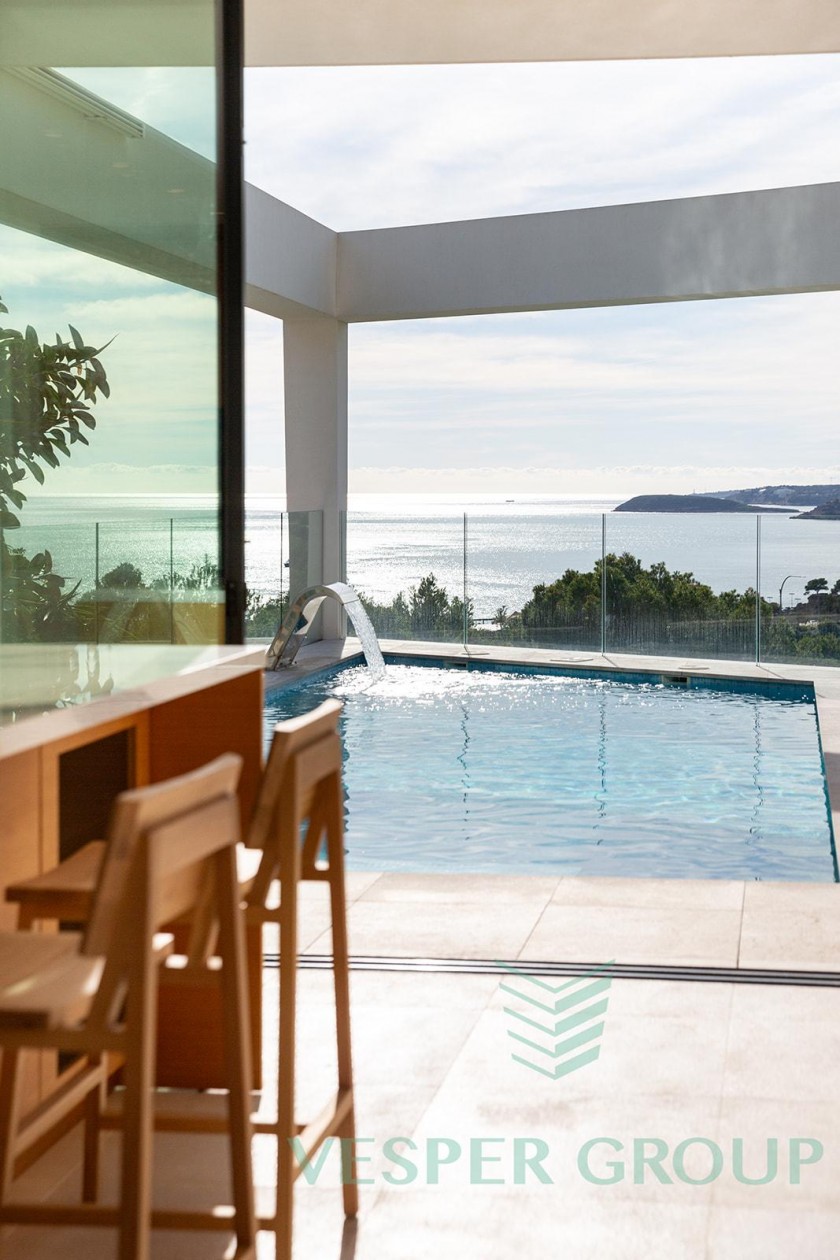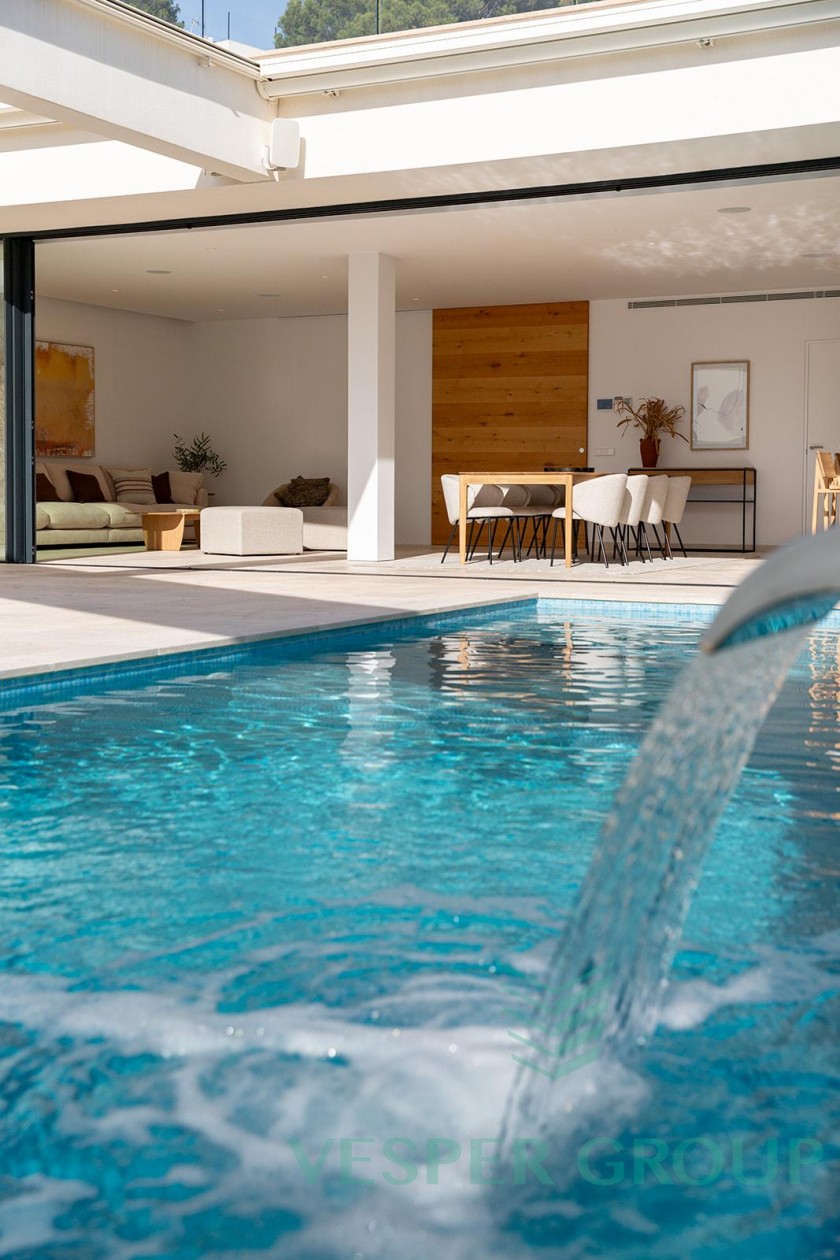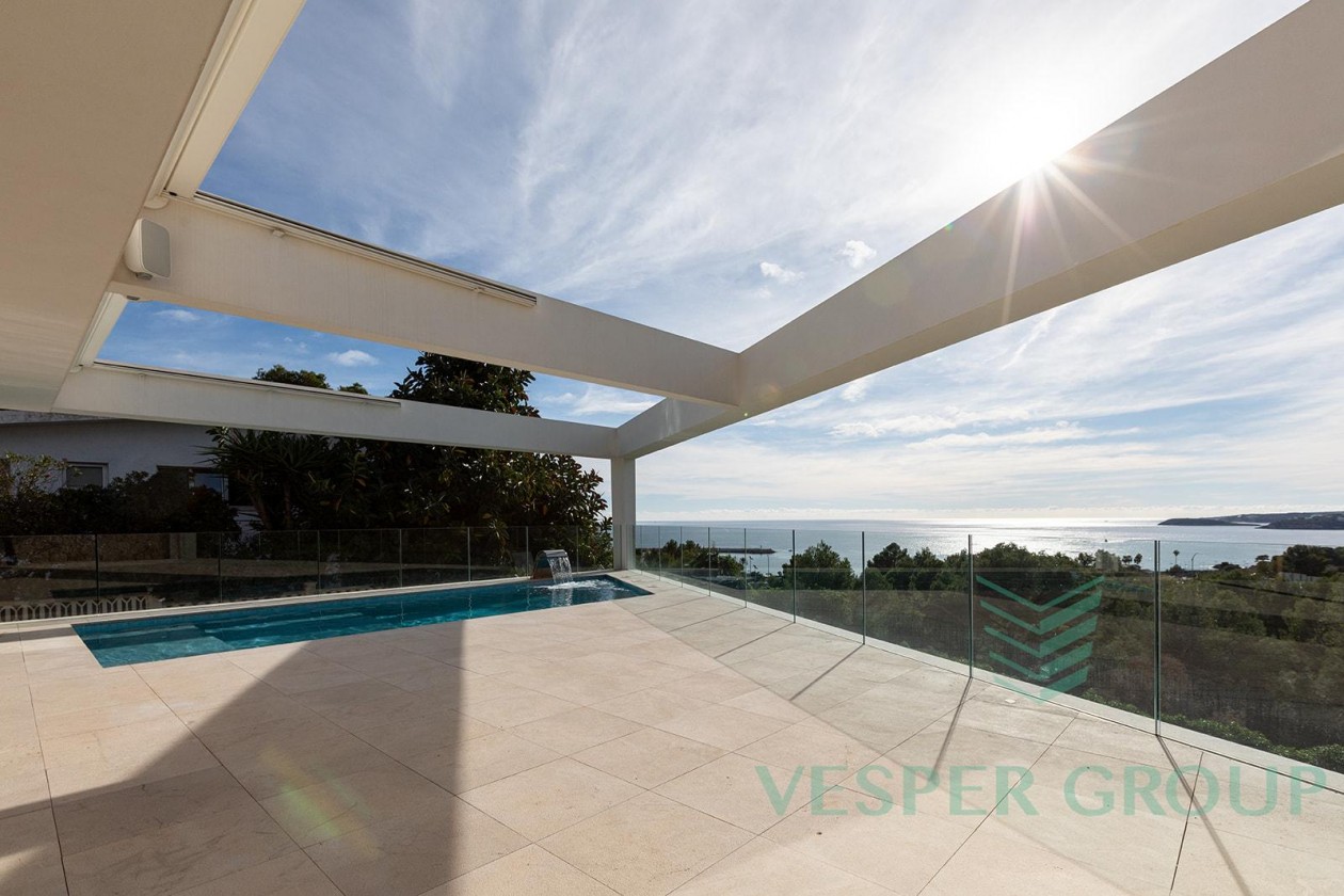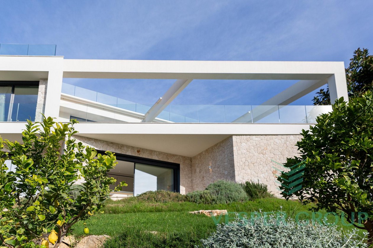 Diese elegante Neubau-Villa in Costa d’en Blanes überzeugt durch zeitgemäße Architektur, lichtdurchflutete Räume und einen fantastischen Meerblick. Sie befindet sich auf einem 1.174 m² großen Grundstück und bietet eine bebaute Fläche von 450 m², verteilt auf zwei Ebenen sowie eine großzügige Dachterrasse. Bereits beim Betreten der Villa öffnet sich durch bodentiefe Fenster der Blick auf das Mittelmeer – ein Panorama, das sich durch den gesamten Wohn- und Essbereich sowie die offene Küche zieht. Auf dieser Eingangsebene befinden sich zudem ein Gästezimmer mit Bad en suite und ein separates Gäste-WC. Im unteren Bereich der Villa liegen drei weitere Schlafzimmer, darunter die großzügige Master-Suite – alle mit eigenen Badezimmern en suite. Insgesamt stehen 4 Schlafzimmer und 4 Bäder zur Verfügung, was ausreichend Platz für Familie und Gäste bietet. Der gepflegte Garten mit großzügiger Rasenfläche eignet sich hervorragend für Kinder oder Haustiere. Ein weiteres Highlight ist die Dachterrasse mit Meerblick, die sich ideal für entspannte Abende oder gesellige Zusammenkünfte eignet. Ausstattung im Überblick: • Grundstücksfläche: 1.174 m² • Bebaute Fläche: 450 m² • 4 Schlafzimmer, 4 Badezimmer • Gäste-WC • Offene Küche mit Meerblick • Bodentiefe Fenster • Dachterrasse mit Panoramablick • Familienfreundlicher Garten • Ruhige und exklusive Wohnlage