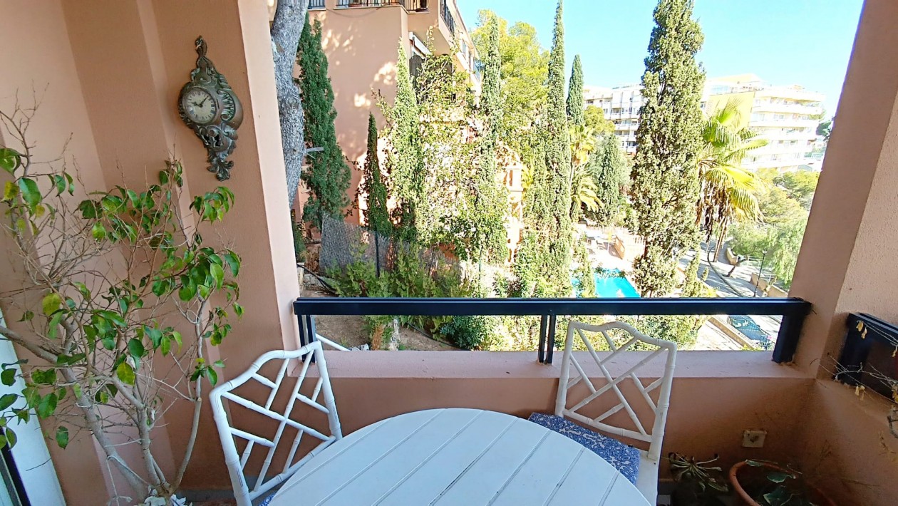 Schöne 2-Zimmer-Wohnung mit Gemeinschaftspool und Parkplatz zum Kauf in den begehrtesten Gegenden im Westen Mallorcas. Die Wohnung muss renoviert werden.