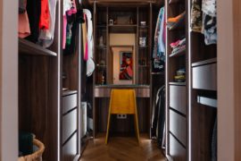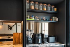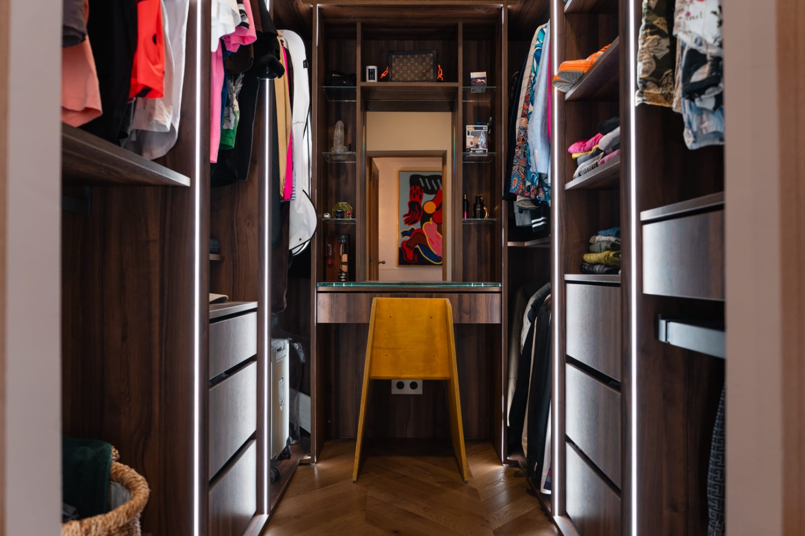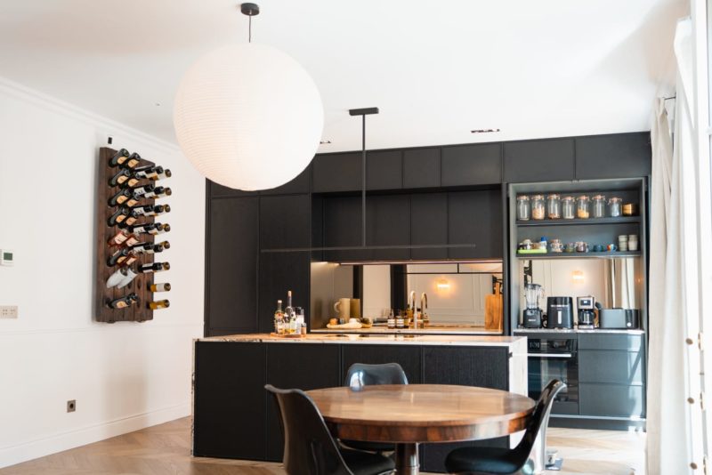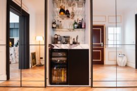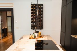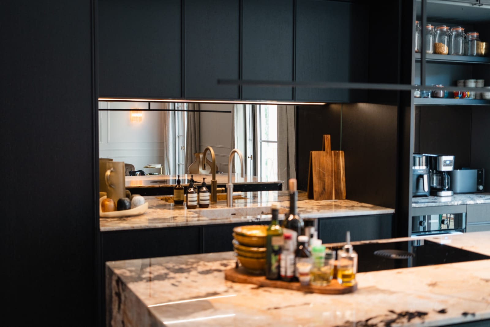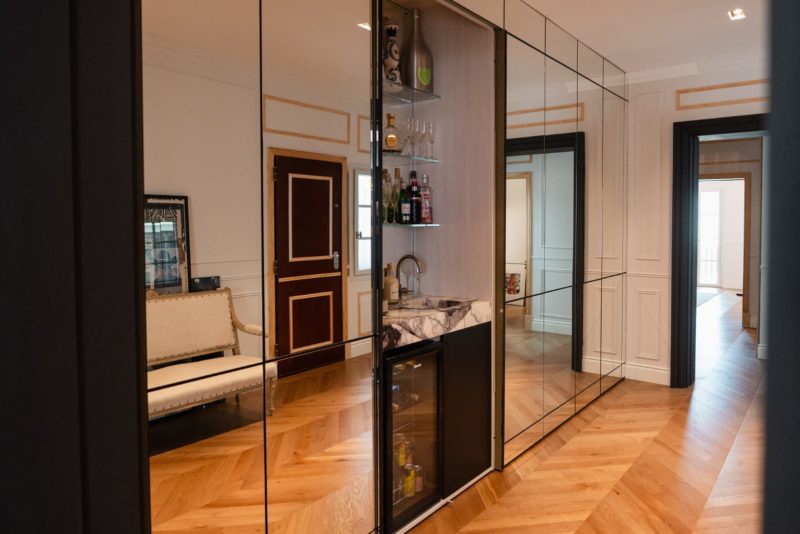 Die Eingangshalle beeindruckt mit raumhohen Einbauschränken mit Spiegeln und einer eleganten, maßgeschneiderten Bar mit Marmorarbeitsplatte, Spüle, Kaffeemaschine und Getränkekühlschrank. Die Designerküche ist das Herzstück der Wohnung und verfügt über Miele-Geräte, ein Bora-Kochfeld, einen Quooker-Wasserhahn (sprudelndes, abgekochtes und gefiltertes kaltes Wasser) und eine atemberaubende Arbeitsplatte aus poliertem Patagonia-Stein mit Einlagen aus Quarz und Halbedelstein.